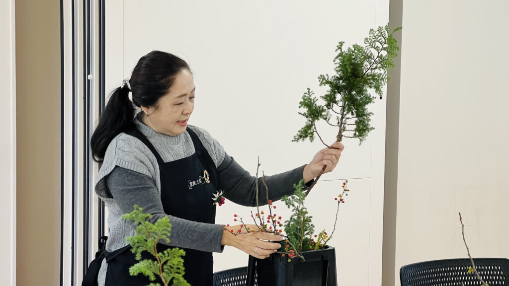 一方、お母さんと娘さんは枝の向きを一つひとつ確認しながら「ここが正面になるようにしよう」「この枝はあえて残したいね」と細かいバランスまで丁寧に調整しており、息の合った親子のやりとりが印象的でした。