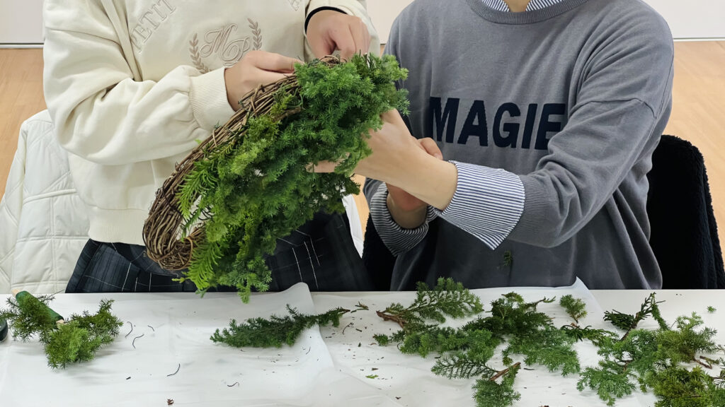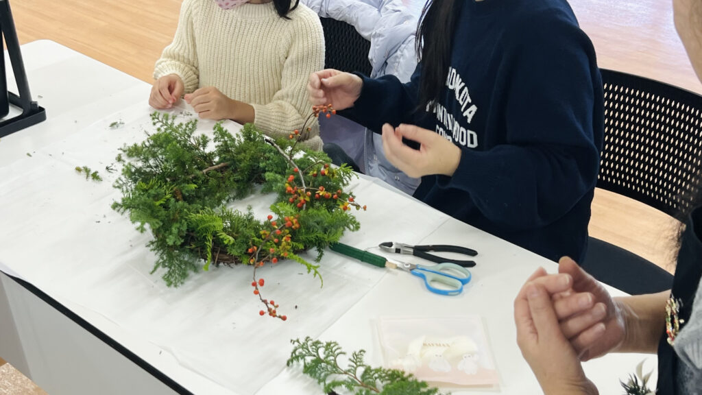今回使用した花材は、クジャクヒバ、ヒムロスギ、セッカンスギ、つるウメモドキの4種類。それぞれ色合いや香り、質感がまったく異なり、組み合わせることで豊かな表情が生まれます。リース台座にヒバを一束ずつ巻きつけていく工程では、作業を始めた瞬間に天然ヒバの爽やかな香りがふわっと立ちのぼり、子どもたちからは「いい匂い!」という声があがってました。