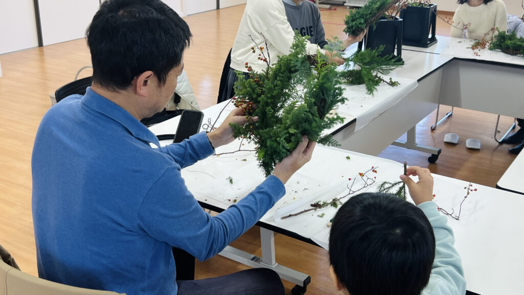 お父さまと息子さんの組では、太めの枝を使ってボリュームのあるリースにしたいという思いが伝わってきて、ワイヤーをカットしながら「次どこに入れる?」と相談し合う姿がとても微笑ましかったです。