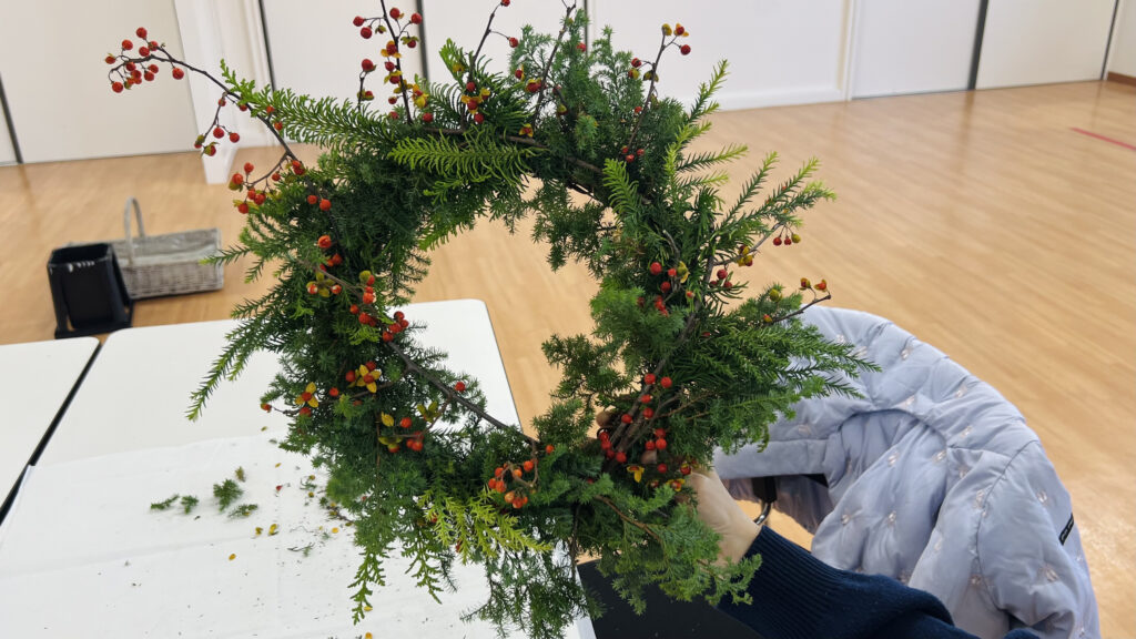 仕上げに添えたつるウメモドキは、赤い実が鮮やかなアクセントになり、作品全体を一気に華やかにしてくれます。娘さんは実のつき方を見ながら慎重に配置し、お母さんと一緒に左右のバランスを確認しながら飾り付けていました。同じ材料を使っていても、枝の向きや組み合わせによって全く異なる雰囲気のリースが生まれるのは、天然素材ならではの楽しさだと改めて感じました。
